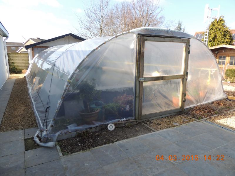 Omdat ijn vijver nogal groot is , heb ik besloten om er een pollytunnel over te plaatsen. De foto's zijn van vorig jaar en daarbij heb ik geleerd dat noppenfolie wel ok is maar het regent voortdurend. Door de verdamping , hangen er steeds waterdruppels onder de noppen die dan een constante regen veroorzaakt. Dit jaar heb ik professionele serrefolie geplaatst en het gaat stukken beter , beter lichtinval, de verdamping glijdt langs de folie naar de zijkant, geen gedruppel meer , betere lichtinval is ook goed voor de planten en de vissen.